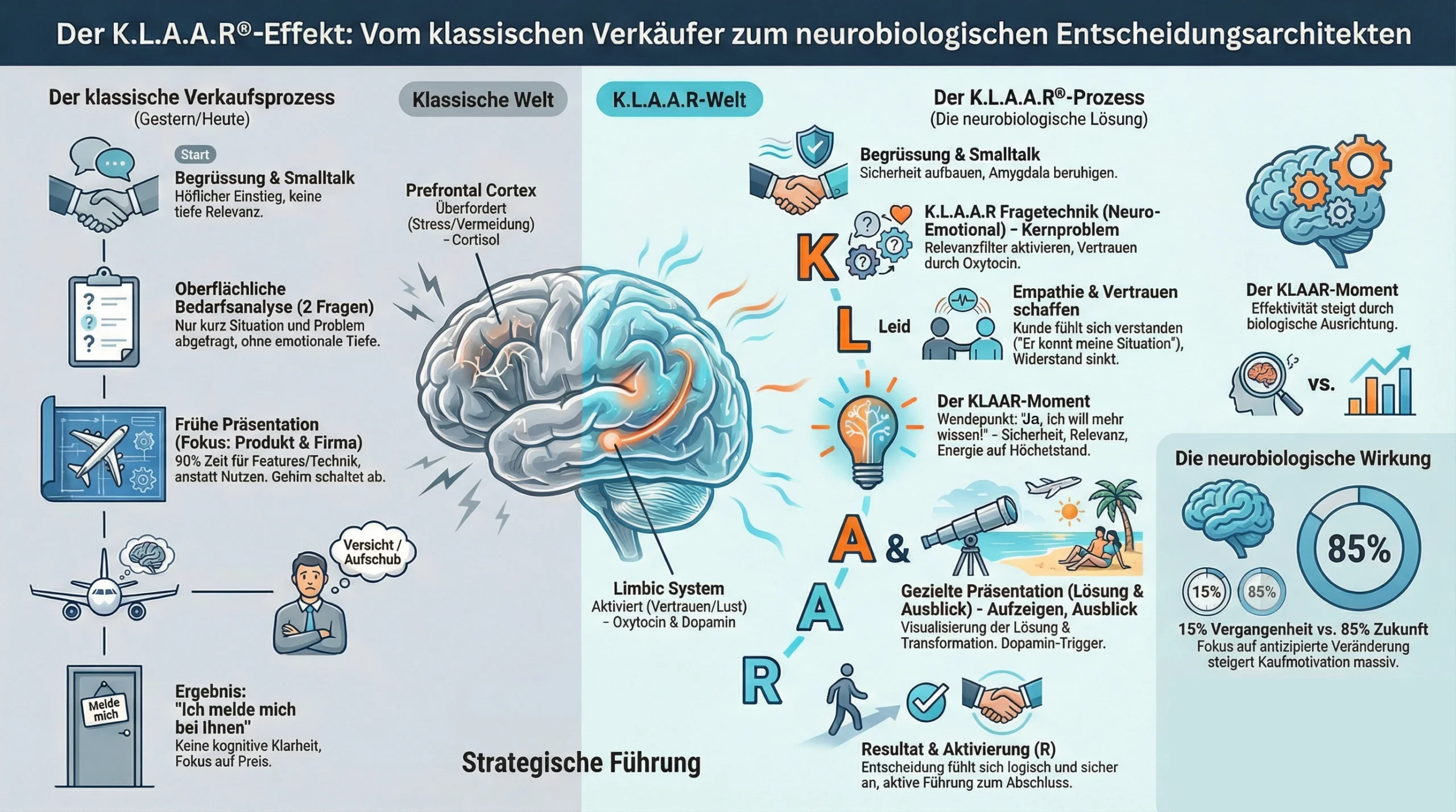 Die Konsequenz: Mal klappt's, mal nicht. Ohne zu verstehen, warum. Die Lösung: K.L.A.A.R® macht Verkaufsgespräche neurobiologisch steuerbar – für Sie, Ihr Team oder Ihre gesamte Organisation.